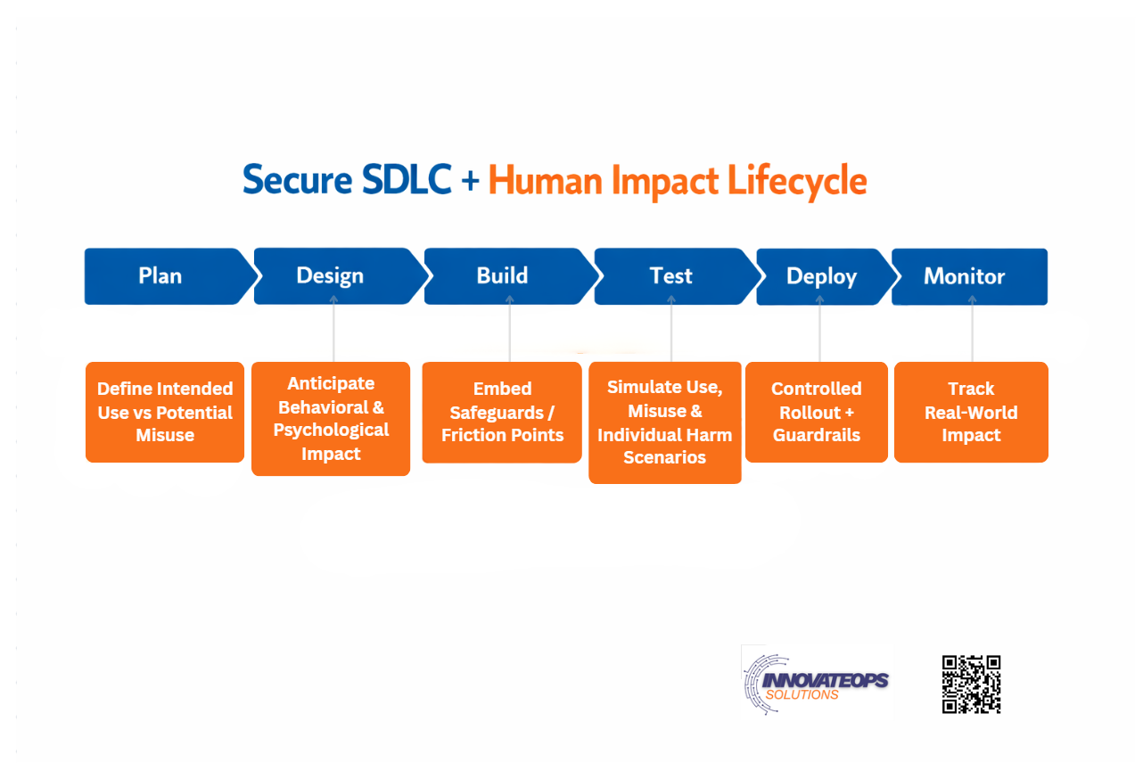 Focuses on system integrity and vulnerabilities, without addressing human behavior, misuse patterns, or downstream impact at scaleSDLC / Secure SDLC (OWASP)Provides structure, security rigor, and repeatable development practicesDefines principles but lacks consistent, testable integration into product development workflowsResponsible AI (IEEE P7000)Introduces ethical consideration early in the design processFocuses on trust signals rather than measuring or mitigating behavioral and societal consequencesTrust by Design (OECD AI Principles)Emphasizes transparency, accountability, and user trustCenters user interaction, but does not account for long-term behavioral, psychological, or societal impactHuman-Centered Design (Interaction Design Foundation)Optimizes usability, accessibility, and user experiencePrioritizes security and compliance automation without addressing human impact, misuse, or second-order effectsDevSecOps (OWASP / DevSecOps Foundation)Integrates security continuously into development and deployment pipelinesPrimarily oriented toward system and organizational risk, not cumulative human or societal impact over timeRisk Management Frameworks (NIST AI Framework)Provides structured risk identification, assessment, and continuous monitoringSo what does this mean in practice?